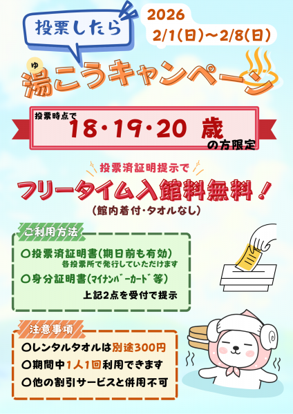■キャンペーン概要 内容:投票済の18~20歳の方を対象にフリータイム入館料(館内着付・タオルなし)を無料提供 実施期間:2026年2月1日(日)~2月8日(日) 対象者:選挙投票時点(期日前投票含む)で18歳・19歳・20歳の方 (2005年1月29日~2008年2月8日生まれ) 利用条件:入館受付時に描き2点を提示 ○各投票所で発行される投票済証明書(期日前投票で発行された証明書も有効) ○身分証明書(マイナンバーカード等) 対象店舗:おふろcafé bijinyu(静岡市葵区籠上15番15号)