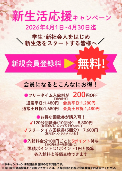 2026年4月1日~30日まで、新規会員登録が無料となります。ご来館の際に、受付にて会員登録をお済ませください。